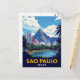 Vibrant, retro-style travel poster of São Paulo, Brazil, featuring the city skyline, a reflective lake (likely Ibirapuera Park), and a dramatic mountain background.