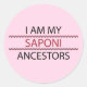Show your Indigenous pride with this "I Am My Ancestors: Saponi" round sticker with red and black text by Chained Dolls.