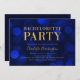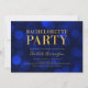 Chic bachelorette party invitation featuring the words "Bachelorette Party" in faux gold foil against a sapphire blue bokeh lights pattern background. Invitation has a blue colour background back side.