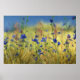 Vivid blue chicory and cornflowers bloom in a golden field of grass under a pale blue sky. The blonde and green background is also interrupted by the sparkling pink of muhly grass flowers.