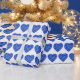Watercolor painting of blue sapphire hearts on a pattern wrapping paper. Ideal for romantic sapphire gifting, 45th sapphire wedding anniversary gifts, gifts for those born in September who has the birthstone of sapphire and other blue sapphire events. Original watercolor art and design by Sarah Trett for www.mylittleeden.com