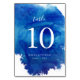 Custom printed wedding table number cards with an abstract blue watercolor background to coordinate with our Sapphire Tide collection. Please personalise each number that you need and add each to your cart individually to ensure accurate printing. Use the design tools to edit the text fonts and colours or upload your own photos to create a unique one of a kind design. This ocean-inspired design is perfect for a destination wedding on the beach!