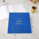 Is sapphire blue your wedding colour? Consider this sapphire blue floral wedding guest book. The front of the card has the name of the wedding couple and date of the wedding ceremony. The side panel features the name of the couple. The back also has the couple's name and date of the of the wedding ceremony. Features floral design and real foil. Use the template to personalise.