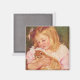 Sara Holding a Cat (1908) by American impressionist artist Mary Cassatt. Original fine art painting depicts a portrait of a little girl wearing a pink dress and holding a kitten.