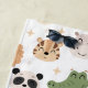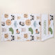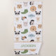 Cute brown, beige, green and blue Safari, Jungle, zoo baby animals including, a lion, giraffe, hippo, zebra, elephant, crocodile, tiger and panda. Add a name in all caps custom text on personalised childrens beach towel.