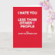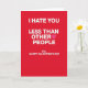 This bold Valentine’s Day card features a deep red background that sets a strong, emotional tone. In the center, white text reads “I HATE YOU LESS THAN OTHER PEOPLE,” with a small pink heart replacing the “O” in “OTHER” for a playful, sweet twist.