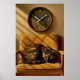Sardine O’clock Dreamtime – Surreal Cat Art. A dreamy, surreal image where time itself revolves around a cat’s stomach. Here, a dozing feline curls on a vintage chair beneath a clock whose hands are sardines, humorously announcing it’s always dinnertime in the world of dreams. Golden light and mid-century tones lend a nostalgic, cosy feel to this tender, whimsical composition celebrating feline daydreams.