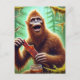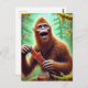 Sasquatch in mossy forest with a jar of beef jerky postcard