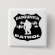 Large black police badge emblem with, “Sasquatch Patrol,” written in simple white font with a white Sasquatch silhouette in the centre and a white pine tree background.