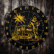 1. Elevate your game room or tourist attraction with this striking black and gold dart board, designed to captivate both enthusiasts and casual players alike. Featuring a unique and whimsical illustration of Bigfoot, also known as Sasquatch or Yeti, this dart board is not just a functional piece but a conversation starter. The artwork showcases Bigfoot leaning against his vintage camper, set against a picturesque beach backdrop complete with a swaying palm tree and a relaxing chair. The gold accents against the sleek black surface create a stunning visual contrast, making it an eye-catching addition to any man cave or retail outlet.