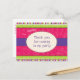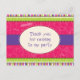 A thank you card for that sassy girl! Perfect for show your gratitude for your guests for coming to your pajama or spa-themed party. Bright tones of green, purple and pink call attention to this postcard featuring watermarks of cosmetics against the leafy swirled background. Available in alternate colours with matching products.