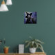 A young witch with large, expressive eyes sits beside a black cat, both enveloped in a mysterious, swirling blue and purple background. Her pointed hat and the cat's golden eyes add an enchanting touch to the scene. This poster is finished in an oil paint print.