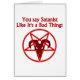 You say Satanist like it's a bad thing! Red & burgundy inverted pentagram pentacle with goat head hanging by horns in centre. Satanic dark humour design by Briana Blair.