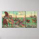 Japanese triptych print shows Sato Masakiyo with horse and page, warriors on a beach, and warriors leading a tiger across water, with two large ships anchored offshore. 1874 woodcut print; attributed to: Utagawa Yoshikata; Signed: Ishinsai Yoshikata gwa; engraver: Horiko Kanegoro.