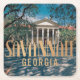 This is an aesthetic picture of Savannah Georgia. The Savannah design was created with generative art. There is a historic building with columns, a red roof and grey brick sidewalks. Savannah Georgia is in faux gold foil text. The coaster is a square paper pulp coaster. The set contains 6 coasters.