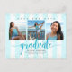 Make sure all your friends and relatives will be able to celebrate your daughter’s milestone graduation! Send out this stunning, simple, modern, girly, personalised three photo “Save the Date” postcard for an event to remember. Sparkly turquoise typography script overlays a baby turquoise blue and white striped background with tiny turquoise and gold confetti dots. Add three photos of your choice and personalise the custom text with your graduate’s name, school name and date. Your custom message, a turquoise blue graduation cap icon and your return address adorn the back. Matching invites, thank you cards, cap toppers, napkins, plates and other graduation goodies are also available in this trendy and stylish collection. Guaranteed to add stylish fun to her special occasion!