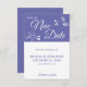 Elegant and romantic floral Save The New Date wedding postponement card, featuring a beautiful and delicate white orchids line drawing design at the top, over a classy periwinkle purple background. The lower part is easily personalizable by editing the template fields with your names, date, and location in a modern and simple purple all-caps font over a simple white background.