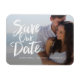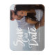 Modern save the date design featuring the words "save our date" in a brushed white, handwritten script with a photo of the happy couple displayed behind. White overlay and wedding details can be positioned anywhere on the card.