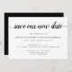 Simple and elegant save the date cards notify your guests of your rescheduled or postponed wedding date. Crisp white cards feature "save our new date" in calligraphy script lettering, with your names, new wedding date and location beneath in classic black serif type. Add additional information, like your wedding website, to the reverse side in white lettering on a contrasting black background.