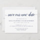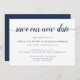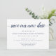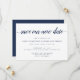 Simple and elegant save the date cards notify your guests of your rescheduled or postponed wedding date. Crisp white cards feature "save our new date" in calligraphy script lettering, with your names, new wedding date and location beneath in classic navy blue serif type. Add additional information, like your wedding website, to the reverse side in white lettering on a contrasting rich navy background.