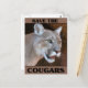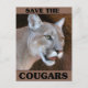A close up of a cougar with the words Save The Cougars surrounding it.