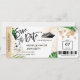 Destination Beach Wedding Boarding Pass Ticket Gold Plane Save the Date with Cruise Ship icon with tropical leaves