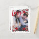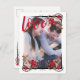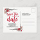 Romantic Roses and Love Save the Date postcard. The front side frames your favourite couple's photo with roses, Victorian accents and the word love written in a bold and open deep red script. The back side of the Save the Date postcard has the same red roses and Victorian corner accents with the phrase Save the Date written in the same red font as love. You can easily add your wedding info and return address.