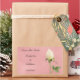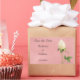 A custom Save the Date sticker with script letters and an elegant white rosebud. An elegant close-up from a vintage botanical painting.