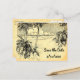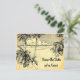 A custom Save the Date postcard with script and sandy letters on a vintage etching of palm trees on a sandy beach and beautiful clouds over calm ocean waves on a faux parchment background.