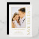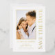 Save The Date Elegant Modern Wedding Gold Foil Invitation Cards features a white background with your custom photo. "Save The Date" is stamped in gold foil adding luxury and style to your wedding save the date cards. Personalise with your text by editing the text in the text boxes provided. Designed for you by ©Evco Studio www.zazzle.com/store/evcostudio