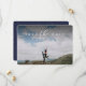 With simple but elegant typography, this save the date is a classic design that features a single horizontal photo. The white wording is placed at the top of the photo along with a darkening filter to allow for better legibility. The back is a speckled navy blue, but the colour is editable by clicking "customise."