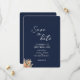 Deep blue 'save the date' for weddings, with watercolor apricot flowers and garden foliage. A simple yet elegant contemporary botanical design inspired by boho vintage style, with monogram on the back.
