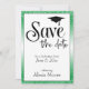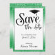 Using two distinctive fonts, I've created graphics for your announcement and embellished them with a faux-metallic gold effect for a festive vibe. The header reads "Save the date" and above it is a graphic depicting a graduation cap. All text was placed over a bordered white rectangle which overlays a green background. White confetti and a white ombre graphic over that bright colour completes the border effect. Change the background colour to anything you like! The graduation cap has been placed in the centre of the back. // 130, 131 //