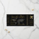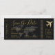 Boarding Pass Plane Ticket Save the Date Invitation Card in chick and elegant black and gold for a modern Destination Wedding featuring a romantic aeroplane logo and world map background and space on the back for travel and accommodations information for guests to start planning their trip to celebrate your marriage in the middle of a vacation.