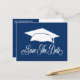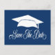 Send out this elegant and classy blue and white graduation postcard to your family and friends. Graduation Save The Date postcard modern and simple design features a graduation cap. Background colour can be changed to match your favourite colour or school colour.