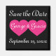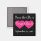 This Save the Date magnet features a pair of hot pink hearts overlaid by template text for the names of the bride and groom. The template text "save the date" appears above the hearts, and a template date appears below. Design can be customised for an engagement party, bridal shower, rehearsal dinner, wedding, anniversary or valentine's party save-the-date or party favour.