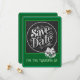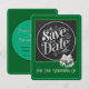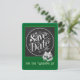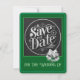 Save The Date Wedding Card Green Design. Front Depicts Monochrome Badge With Words 'Save The Date'. Back In Green Contains The Personalised Details Of The Planned Upcoming Wedding.