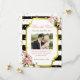 A very pretty black and white striped, gold confetti with pink roses and baby's breath save the date notice.