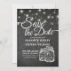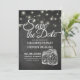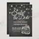 Save The Date Wedding Invitation Card Templates - Elegant Save The Date Lettering Script and Vintage Mason Jar String Lights with Grunge Black Chalkboard Background.