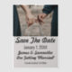 A minimalistic modern photo "Save The/Our Date" announcement card of a young couple holding hands with engagement ring. Order today to send out to all your family and friends. Keep or easily replace this photo with one of yours. Trendy black script typography.