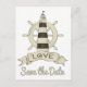 Shout out to the world you and your sweetheart are tying the knot with this fun nautical Save the Date wedding engagement announcement. This cute sailor inspired engagement announcement features a hand drawn tan lighthouse and ship wheel highlighted against crisp white background. Your wedding information is printed on the back of the postcard.