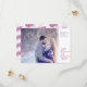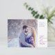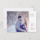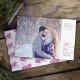Photo on one side with date and hand drawn sketch of pine cones pattern ion the back of this wedding save the date card. In pretty shades of navy dark blue and purple mauve on white. Original hand drawing and design by Sarah Trett for www.mylittleedenweddings.com