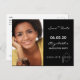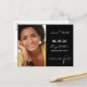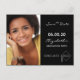 On front: Add your own vertical size photo of the graduate. A chic black background colour. Templates for a name and date. White letters. The name and the text: Save the Date are written with a modern hand lettered style script.