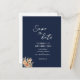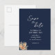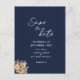 Deep blue 'save the date' for weddings, with watercolor apricot flowers and garden foliage. A simple yet elegant contemporary botanical design inspired by boho vintage style, with monogram on the back.