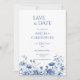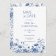 Сard save the date, in blue colours with delicate flowers, floral blue frame, blue vintage collection