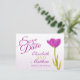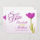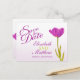 Beautiful single purple tulip on grey pink rustic colour save the date wedding informal invitation. Edit this invitation with your words. Simple modern and romantic invite, ideal for a spring or tulip flower wedding. Design and fine art watercolor tulip painting by Sarah Trett.