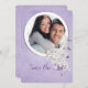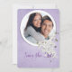 round frame with white flowers and ivy photo frame on purple texture for Save the Date