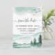Rustic Forest Watercolor Green Wedding Save the Date Card on white background - includes beautiful and elegant script typography with modern trees, mountains and birds for the special Wedding day celebration.