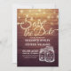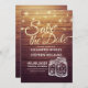 Save The Date Wedding Invitation Card Templates - Elegant Faux Gold Foil Save The Date Lettering Script and Vintage Mason Jar String Lights on Rustic Wood Background.