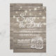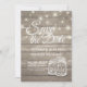 Save The Date Wedding Invitation Card Templates - Elegant Save The Date Lettering Script and Vintage Mason Jar String Lights on Rustic Wood Background.